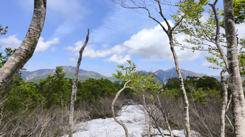 地形的な要因だろうが、尾根芯はべっとりと雪が付いて雪原となっており、その奥に大笠山と笈ヶ岳が間近に迫る。
