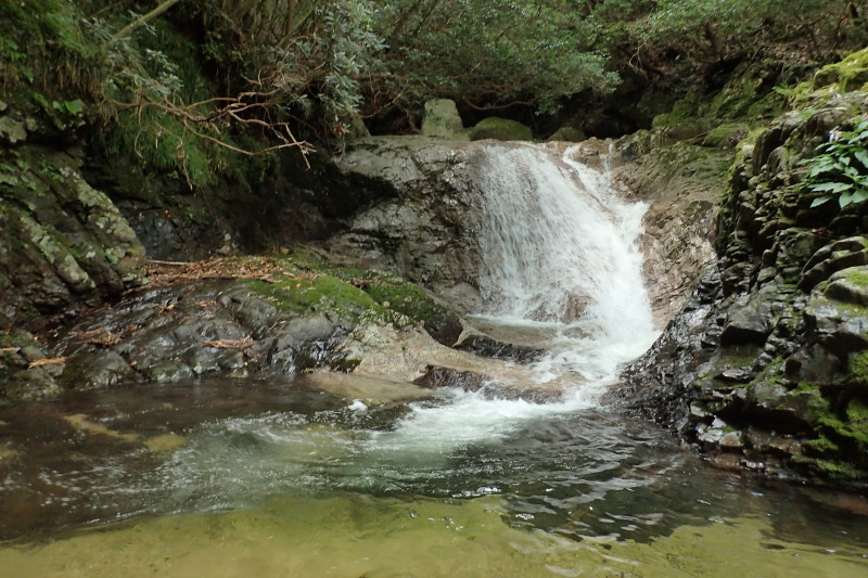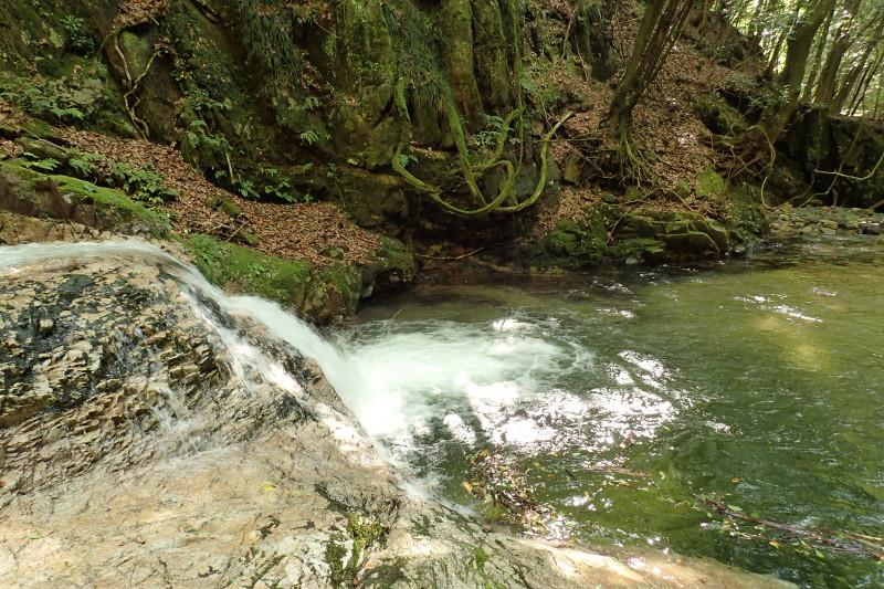 きれいな淵を見ながら谷は90度右折して、左岸を岩壁に守られた美しいナメから1mも無いような落差で、小さな