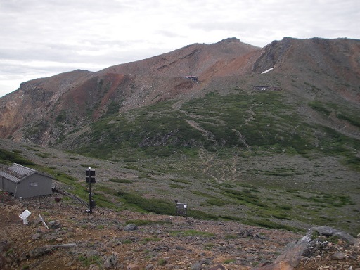 賽の河原避難小屋の上に出ました。剣が峰が正面に見えますが、二ノ池からお鉢巡りで登るコースは立ち入り禁止のままですから一般コースで往復するしかなく最近は行ったことがありません。御嶽講のお参りに来た訳ではないので今日も剣が峰は止めておきましょう。
