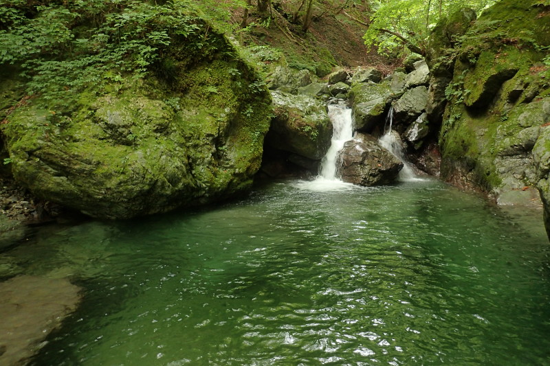 苔むしたゴロゴロとした岩の間を縫う躍動感あふれるうつくしい流れと、緑がかった透き通った淵が印象的でした。