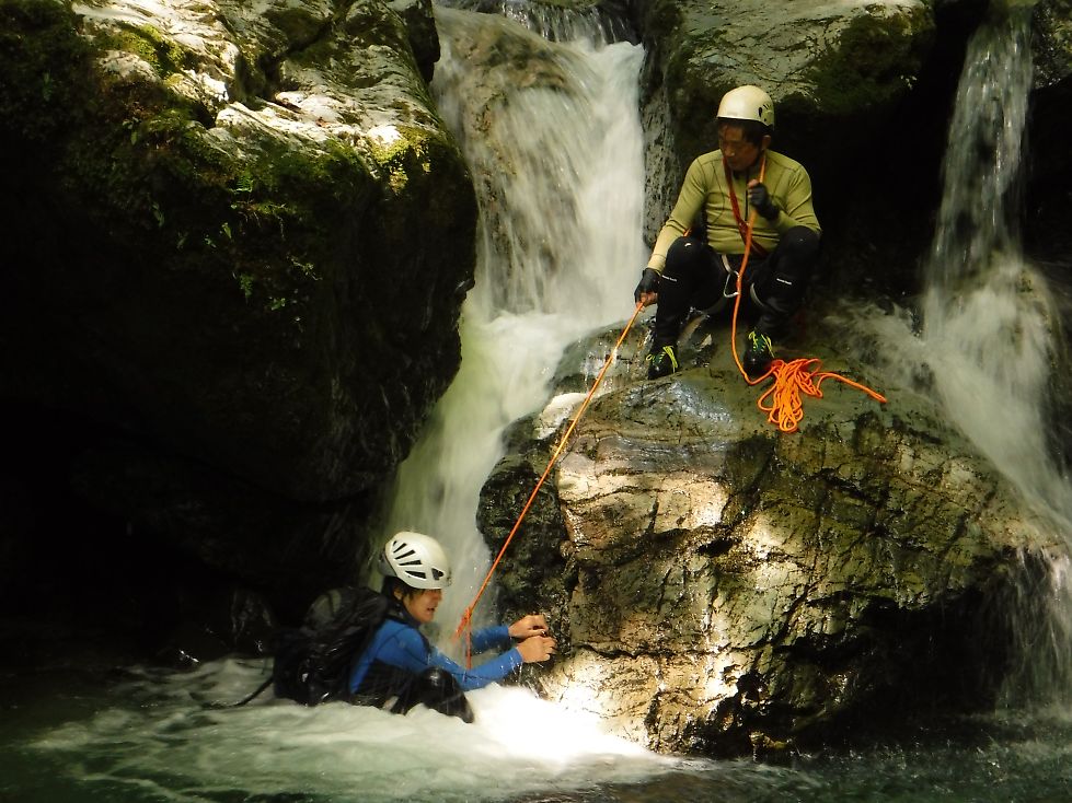 登りで滝を登っている時、ふとした拍子にふくらはぎの痛みがぶり返してしまった。肉離れでしょうね。しばらくはリハビリ沢歩きにして下さい。