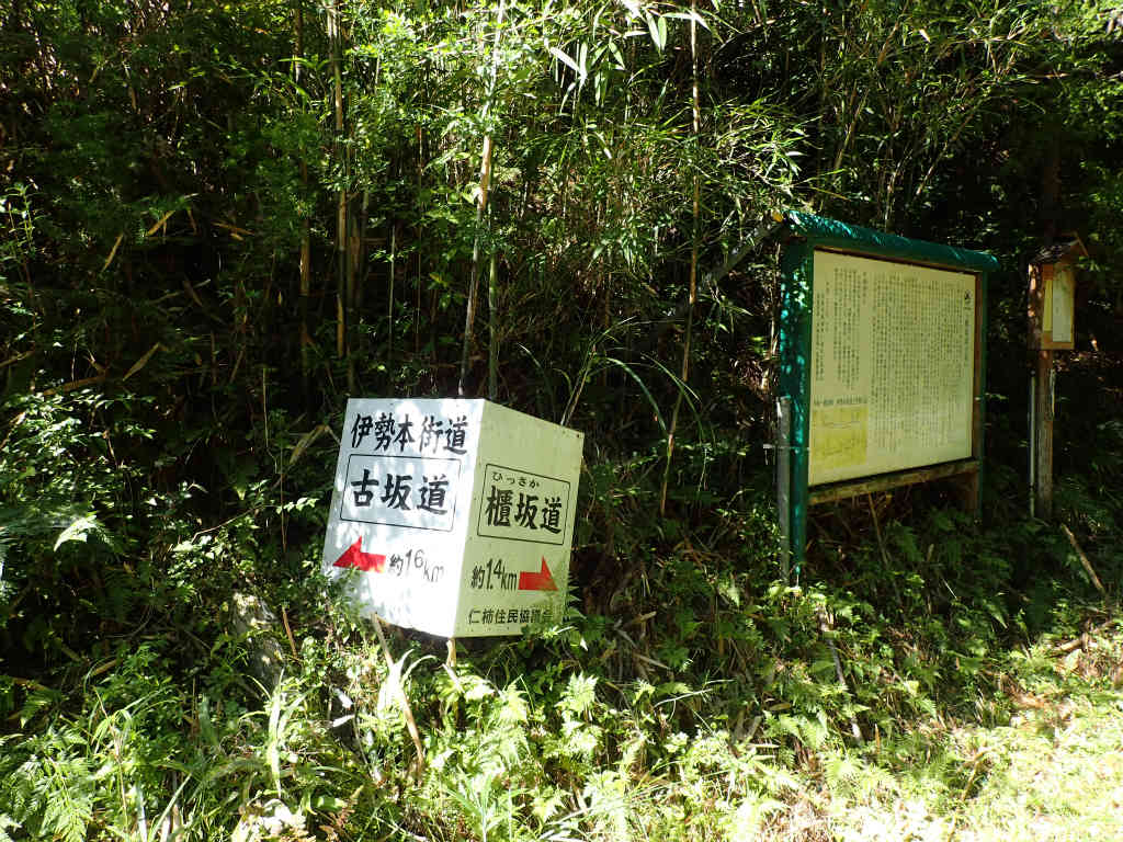 坂の下の集落で,国道358号線を右に見送り,伊勢本街道は仁柿川に沿って西へ向かう。途中,江戸時代初期まで使われていた古坂道と江戸時代初期に新たに開かれた新坂道が分岐する。古坂道は奈良県の御杖神社から川上,丹生俣を経て仁柿に至るコースである。案内書には比較的楽なコースをされているが,わりばしさんのレポだとコースが不明瞭な場所があり,今歩くには必らずしも楽なコースとは言えなさそうである。仁柿からの古坂道は平成23年に地元の有志により復旧されたと書かれているが,ちょうど古坂道となるコース上に新しい車道が建設中であり,もしかしたら消えているかもしれない。