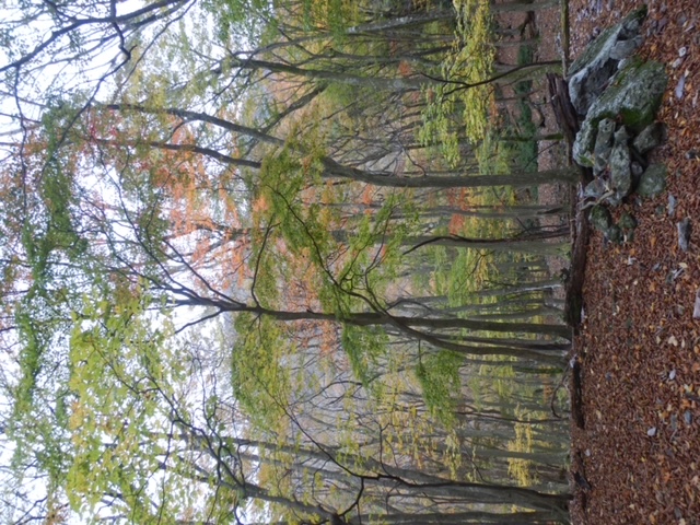 鉄塔以降は自然林の落ち着いた尾根が続く。落ち葉に埋もれた道は時折りわかりにくくなるが尾根筋を行くだけなので問題はない。