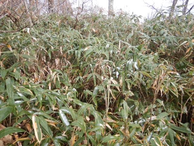 しかし、上部に至ると笹が全面を覆い出した。それでも細い笹が多いので激藪とまではいかない。ただ笹に雪が載りそれが冷たくて敵わない。いい加減なニット手袋はベタベタに濡れ体温を奪う。中途半端な装備を悔やんだ。