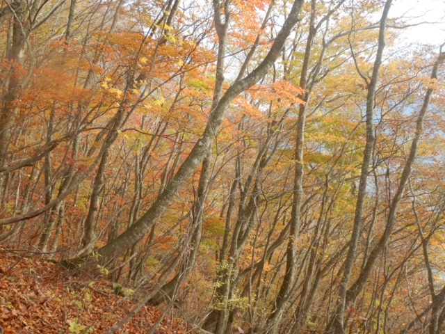 少し登って斜度が緩くなると素晴らしい紅葉に目を奪われる。先週の鈴鹿・烏帽子岳、三国岳も素晴らしかったがその上をいく。