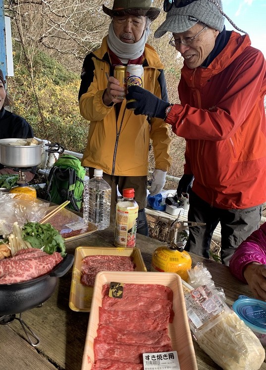 少し下った東屋でランチタイム。今日のメインイベントはこれからだ。ツアコンがチョイスしてくれた飛騨牛(ちょっとだけ愛知のスキヤキ肉も)、シイタケ、白菜、春菊などの盛り上げ野菜もタップリと。ガスコンロ2台でスキヤキ山宴会の始まりだ。
