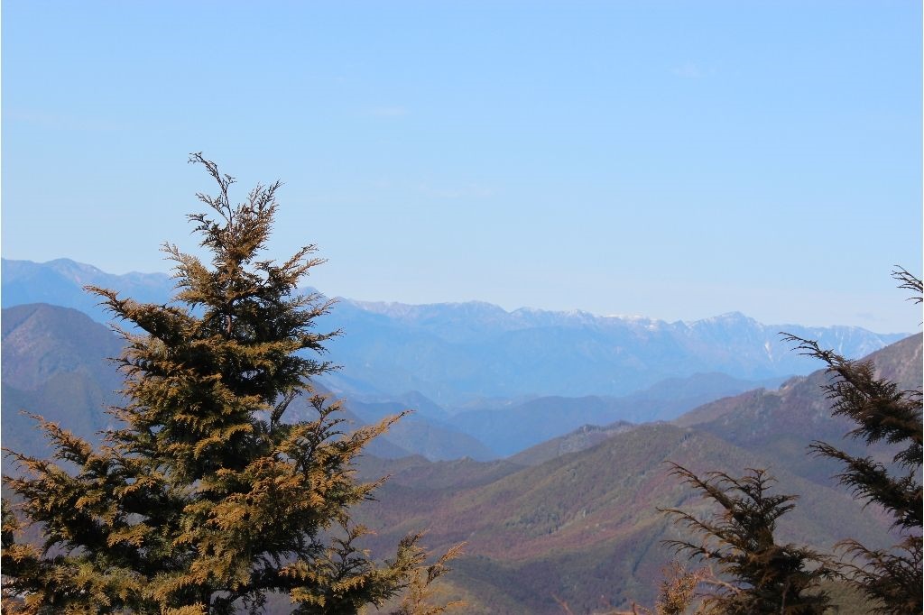 その右には那智の烏帽子山を中心とした南紀の低い山並みが幾重にも見え、さらにその右には大峰南部の山が釈迦ヶ岳まで続いていました。