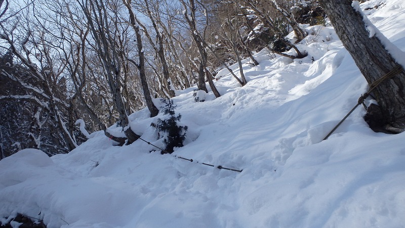 co700ⅿからは急斜面になり、ロープが張られたルートをトレースに案内されてトラバース気味に回り込む。左の藤川谷に10ⅿほどの滝がかかる。ここからはほとんど垂直に近い岩壁だ。地図にある「奇人の窟」の確認も頭にない。雪に埋まったロープを掘り出し、足元の雪を蹴散らしてホールドを確認しながらの登高だが、スノーシューが絡んで危ない。面倒でもここはシューを脱ごう。スノーシューとストック、お助けロープで両手が塞がるが、慎重に足を運び何とかco800ⅿの台地に登りついた。