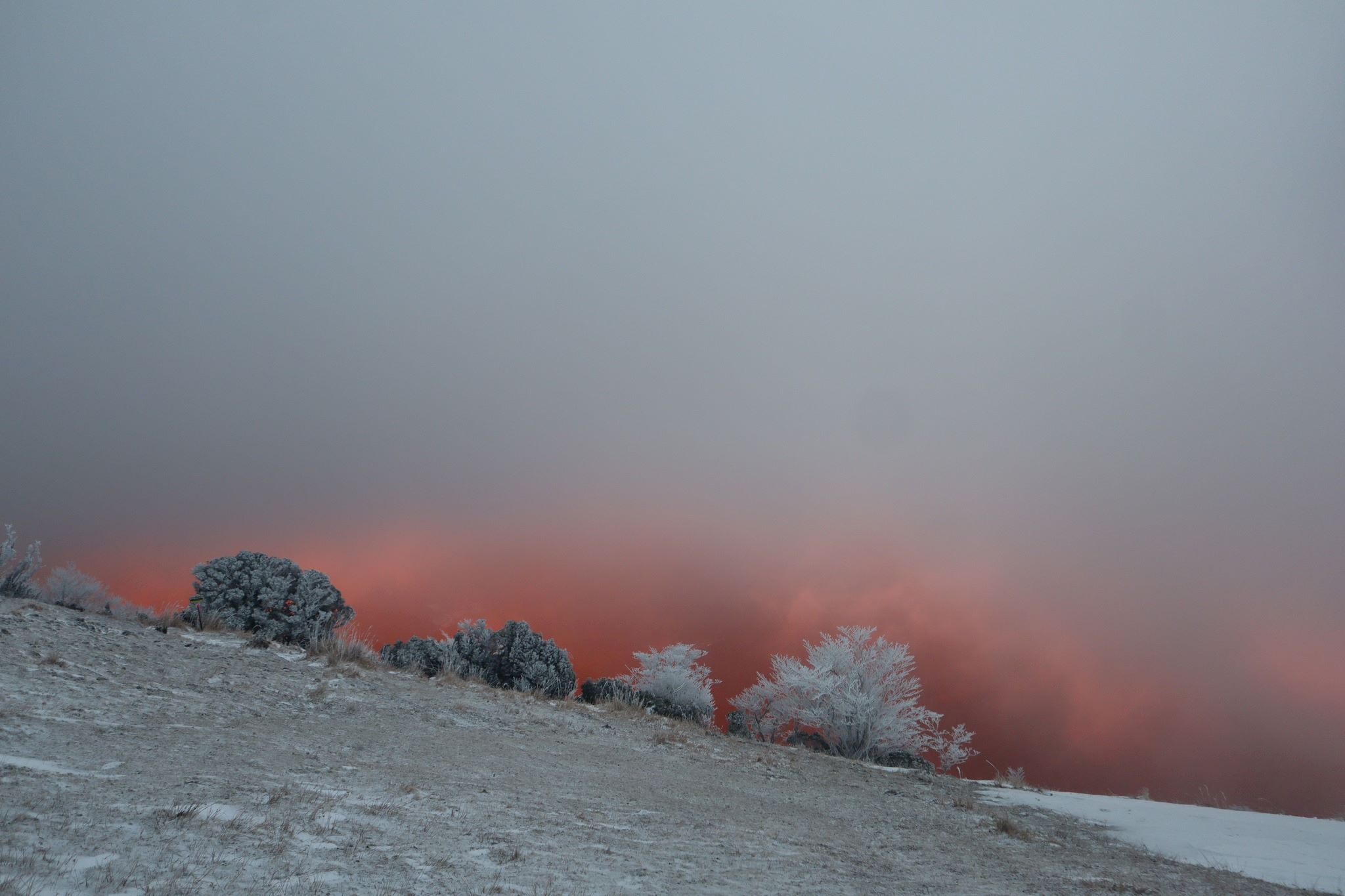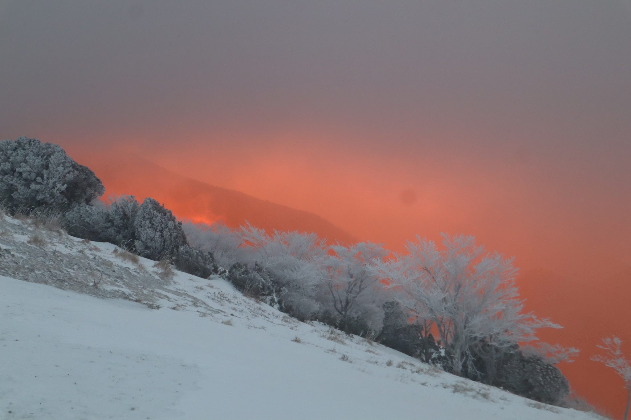 真っ白な霧氷の木の背後に広がったのは、朝日に照らされて赤く染まった霧だった。