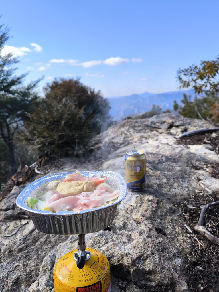 今シーズンの初鍋は思いもよらぬ雪のない山で味わうことになったがこれも一興。まわりを見渡してもどこにも雪