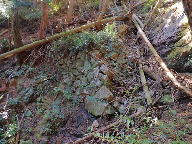 さあ帰ろう。P511手前は南側が植林で北側が自然林になっている。植林側を見ると巻道のようなものがある。昔の巻道が獣道としてかろうじて残っている。急な植林の斜面を慎重に進んでいくと尾根を巻ききり、いやらしい自然林の斜面を回避できた。P511からは二俣に続く東尾根を下る。尾根の山頂部に嵓があり、左側の斜面から回り込むようにして取りついた。この後も、次から次へと嵓が出てきて対応を迫られる。ただ、上りの痩せ尾根と違い尾根が広いのでなんとかなる。植林に入ってホットしたものの嵓はまだまだ出てくる。新しい境界杭のある平地で昼食を取った。尾根は下部で谷に向かって急激に落ち込んでいく。それに伴って、獣道も尾根芯から斜面に逃げていっている。獣道にしたがい下っていくと朝に引き返した二俣の炭窯跡に出た。