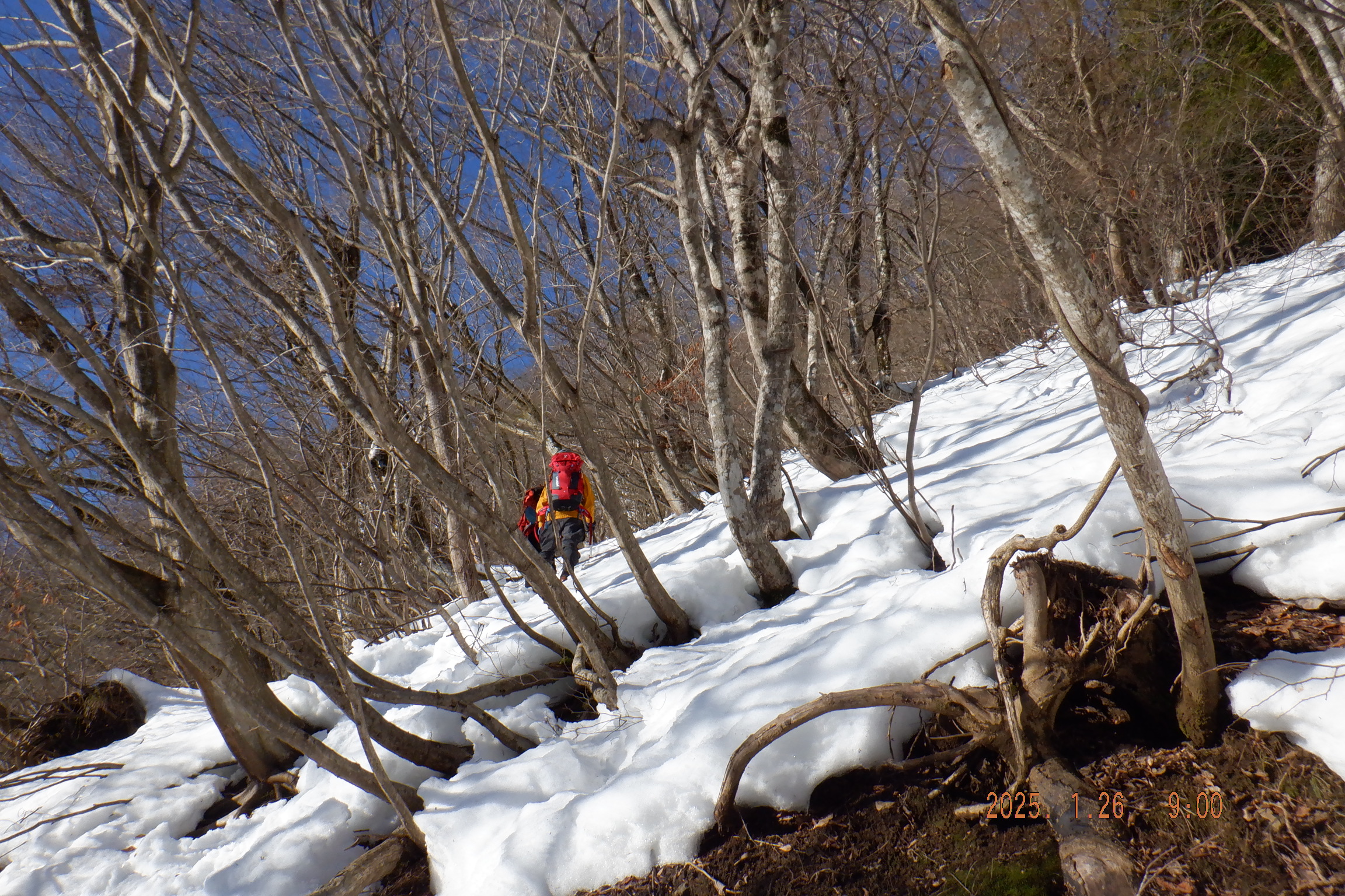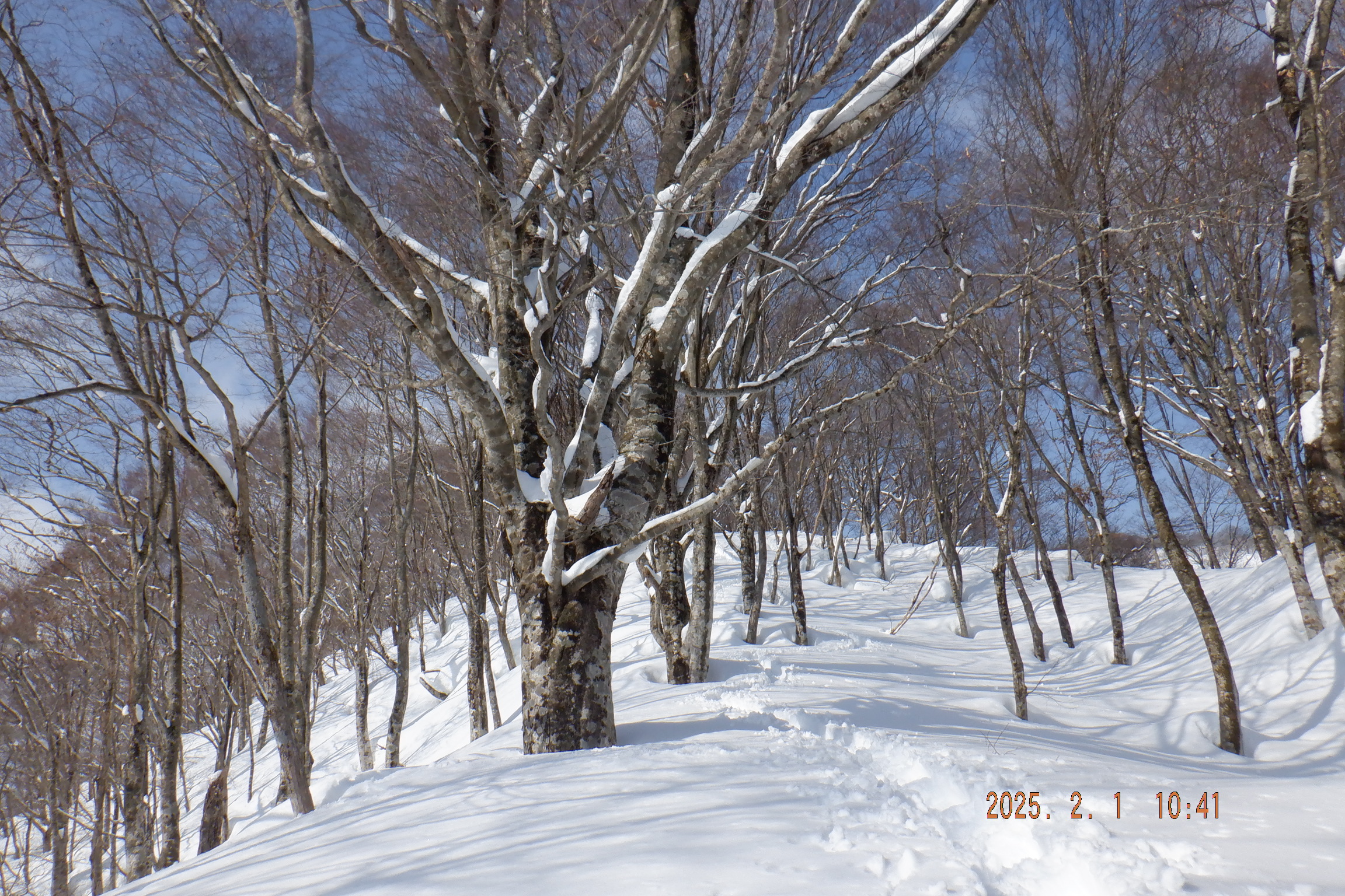 ここは雪が少ないと藪が酷く行く手を阻む。2020年に行った時は登りも下りも深い藪に悩まされたが、今回は雪が多いので普通に登れた。