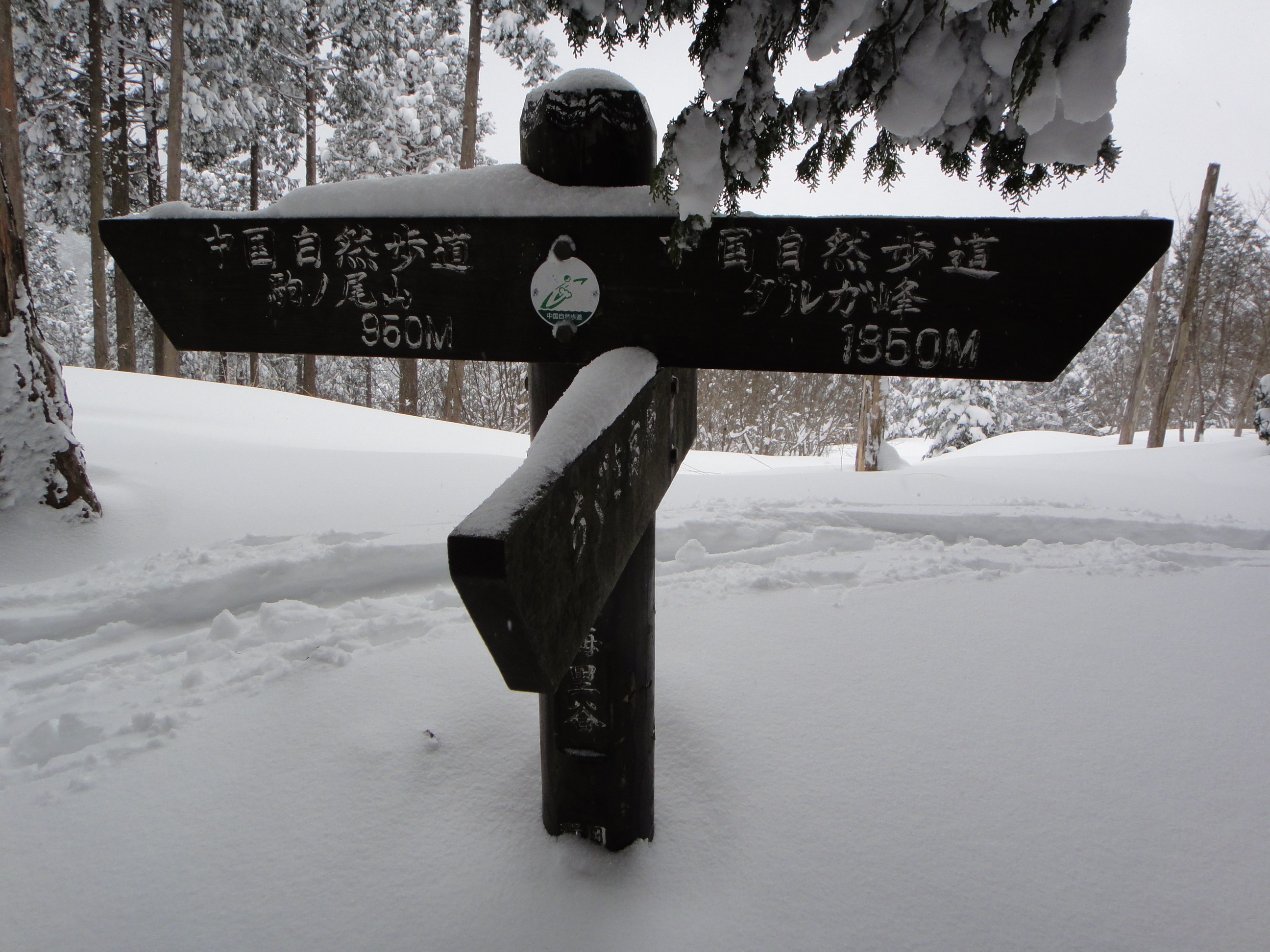 >関西では珍しく深雪、粉雪のパウダーでスキーはシールを装着すると何とか進めたが私のスノーシューだと一歩、一歩沈んでは、また沈んでの苦戦の連続であった。結局、駒の尾山は早々に諦め大海里峠で終了した。これも3人の先行者がラッセルしてくれていたお陰での結末である。