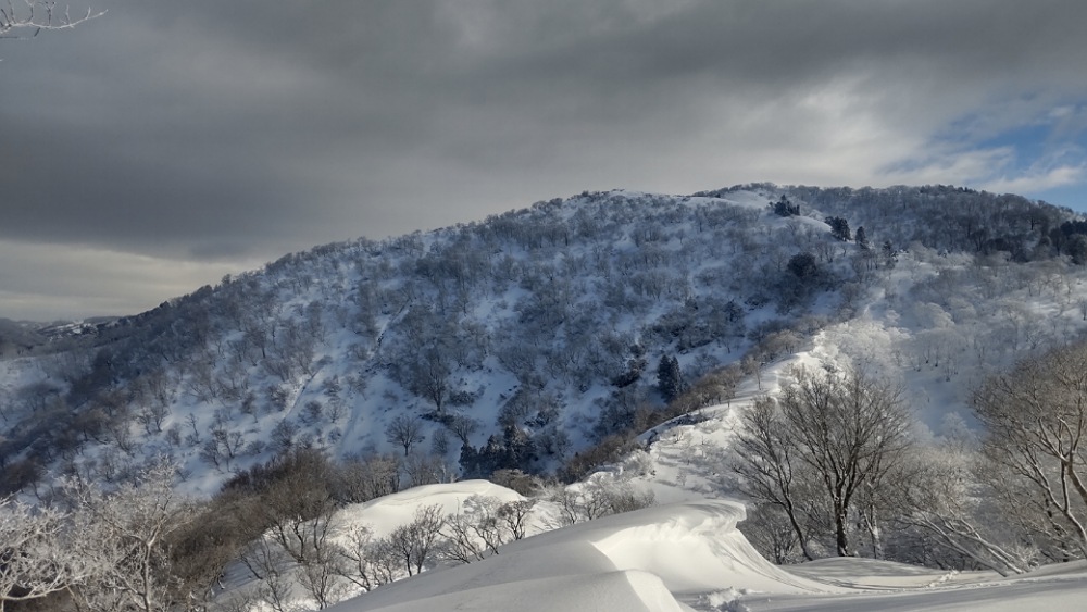 10時。雪質に恵まれ思ったよりも早く着いた。地図を見て、三重嶽を見つめ、空を見上げる。ここから三重嶽にかけての尾根と谷が織りなす地形にもこころ惹かれている。