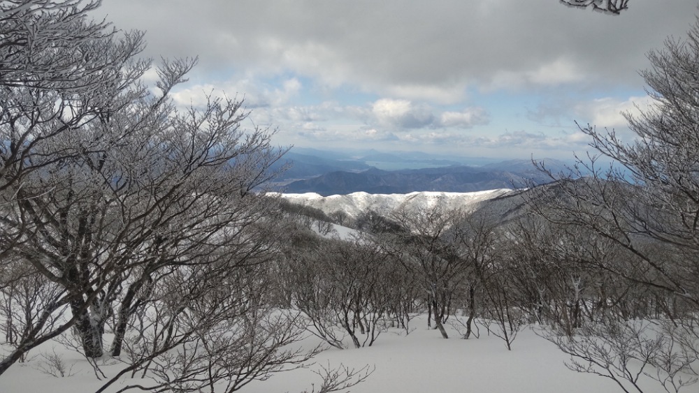 夢のような風景は、この先も続いていった。びわ湖と日本海のふたつの「海」を見下ろすブナが佇むやわらかな尾根は、降り積もった雪でさらにやわらかに広がり、東側の霧氷に飾られた木々の向こうに覗くびわ湖は青磁色の宝石のように輝いている。西側の天増川対岸の県境尾根、その向こうの若狭の山と里は、まるで氷の魔法にかけられたようだった。すべてが凍り付き青白色に光っている。