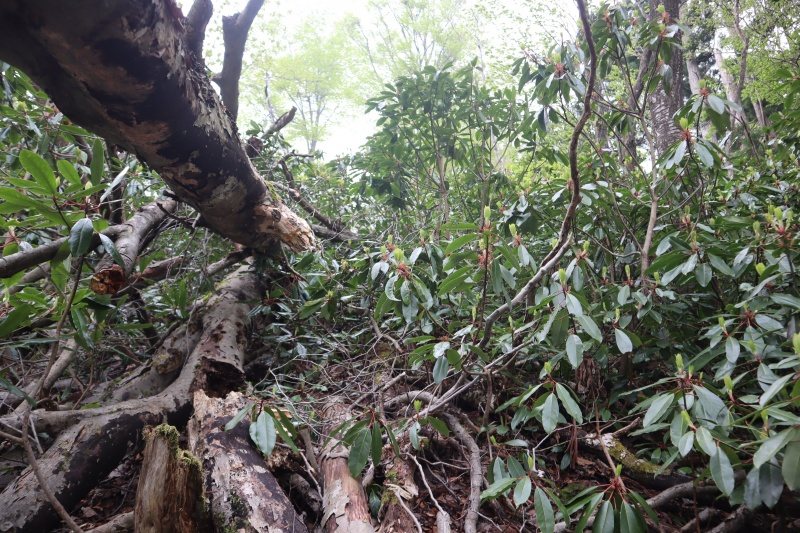 急斜面をよじ登るとほっとしたが、次はヤブ漕ぎだ。シャクナゲかと思ったが、ユズリハだそうだ。