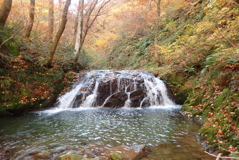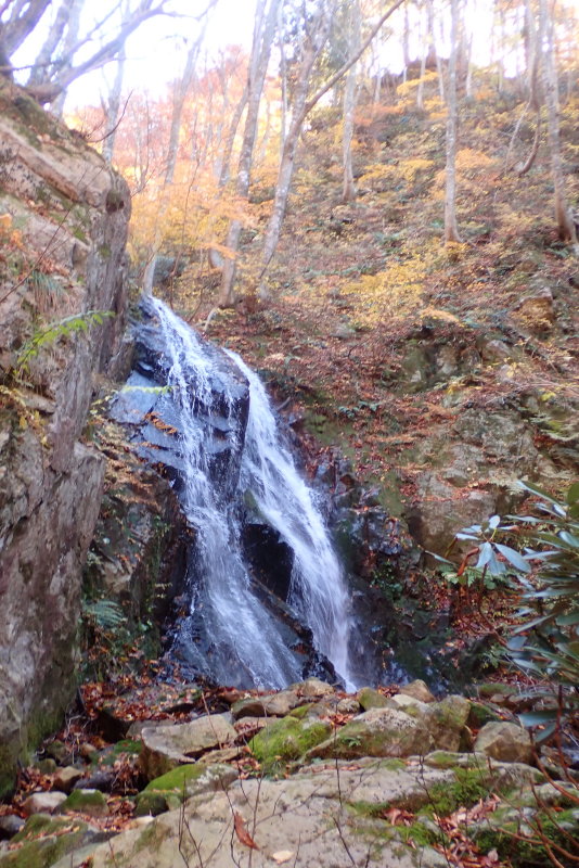 谷に降り立つと植林でしたが、すぐに見事な色彩に彩られた自然林に。穏やかな流れと今が真っ盛りの紅葉の森。ふっと現れるやさしく流れ落ちるちいさな滝。