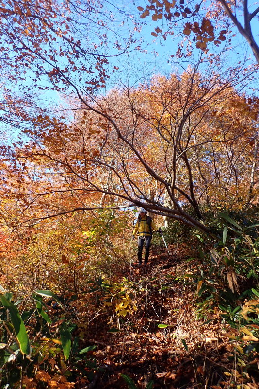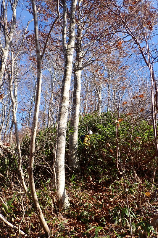 ブナ林までの辛抱、と山日和さんはおっしゃっていたけれど、ブナ林に入っても、ヤブが薄くなったのは、10mくらいで、また猛烈なヤブ。