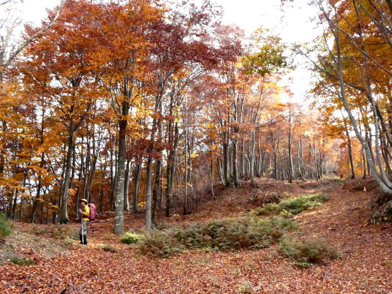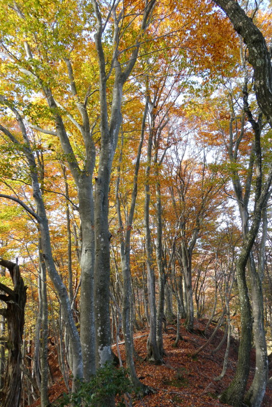 三角点弥谷の手前からブナが増え始め、山頂の先に見事な純林が残されていて驚く。ブナの黄葉も最高潮だ。