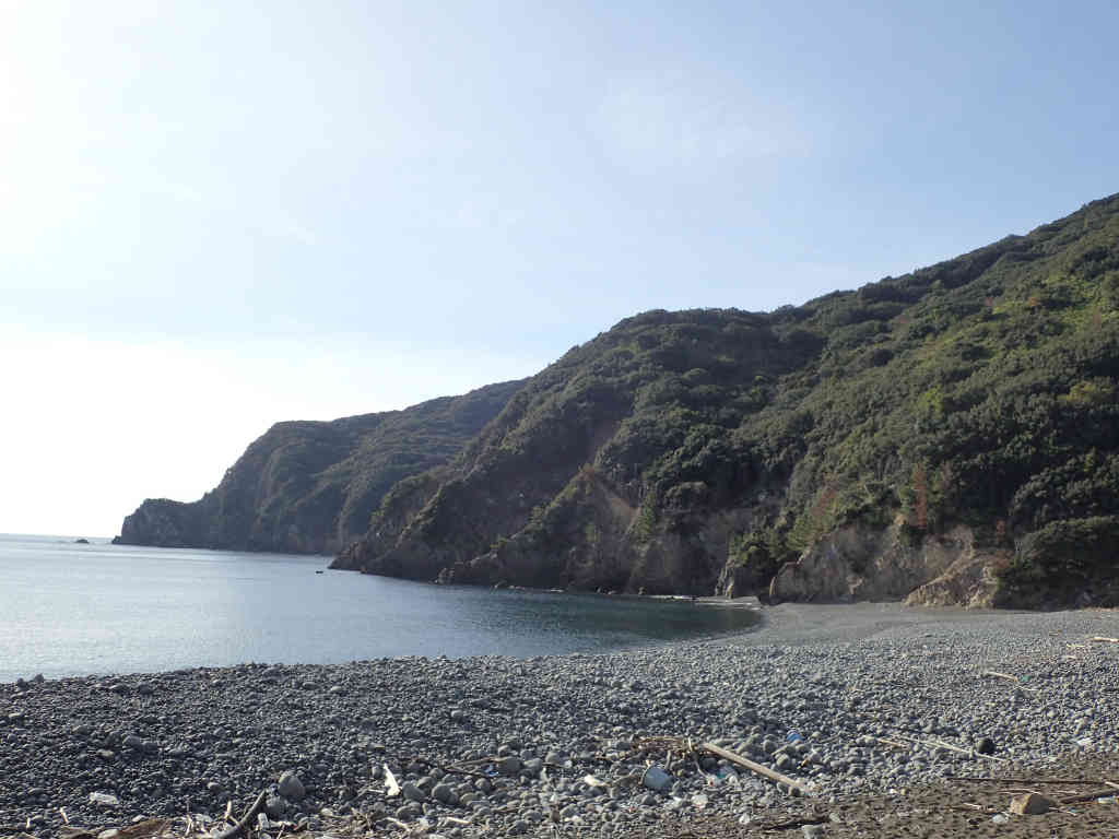 しばらくで米子浜。漂着物が散乱していることを除けば、無人の静かな浜である。米子浜をそのまま通り過ぎ、網代浜に向かう。日当たりのいいところはシダが繁茂しているが、ウバメガシ林の下はシダもなく、どこでも歩いていくことができる。と思って、歩けるところを歩いていたら道を外したようだ。GPSでチェックしてみると、P174に向かって歩いている。本来の道は標高50m付近の切れ落ちた崖の横に通っているようだ。私は沢登りをしているくせに・・・あるいは「しているから」というべきか・・・このような片側が切れ落ちたトラバースが苦手である。ずいぶん緊張する。