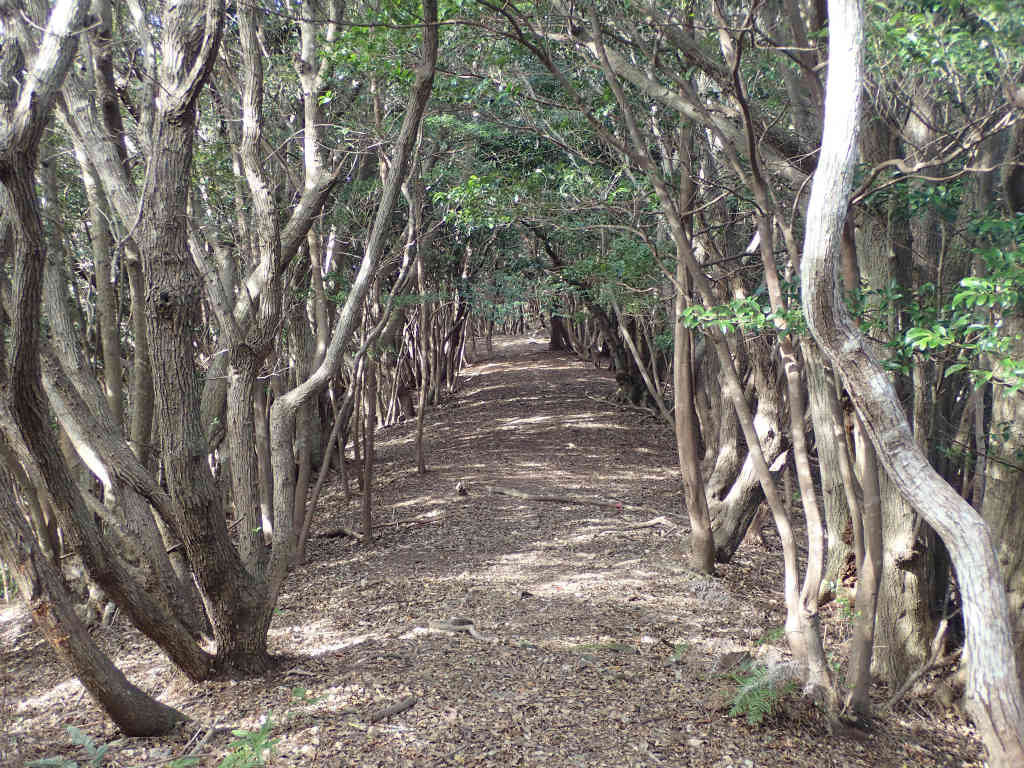 断崖を通り過ぎると、ウバメガシでできたトンネル小径。ほっとする場所である。このあとは局ヶ頂までルンルンのお散歩気分。時々、シダが茂っているが、思っていたほどではない。