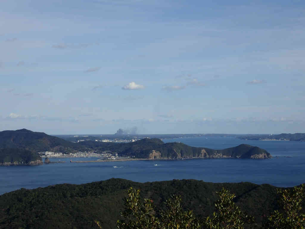 相賀漁港を通ると、朝の漁が終わったのだろうか、漁師の人たちが網の手入れをしている。細いメイン道路である郵便局前を通り過ぎ、左手のコンクリート階段を登ると小尾根である。標高140m付近まで登ると、米子浜への見晴らしのいい分岐。西にはこれから向かう米子浜とその右に局ヶ頂のいただき、東は相賀漁港と、その向こうに三崎の突端、さらにその向こうに浜島と志摩半島が綺麗に見えている。