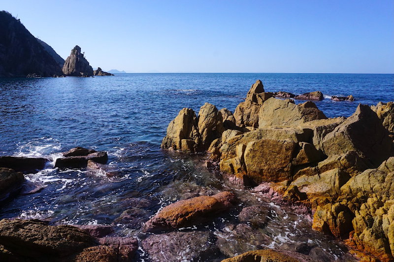 晴れやかに澄み渡った空と、透明な海の水と、伽羅色の岩礁に打ち寄せる白い波を眺め、至福の時間を楽しむ。