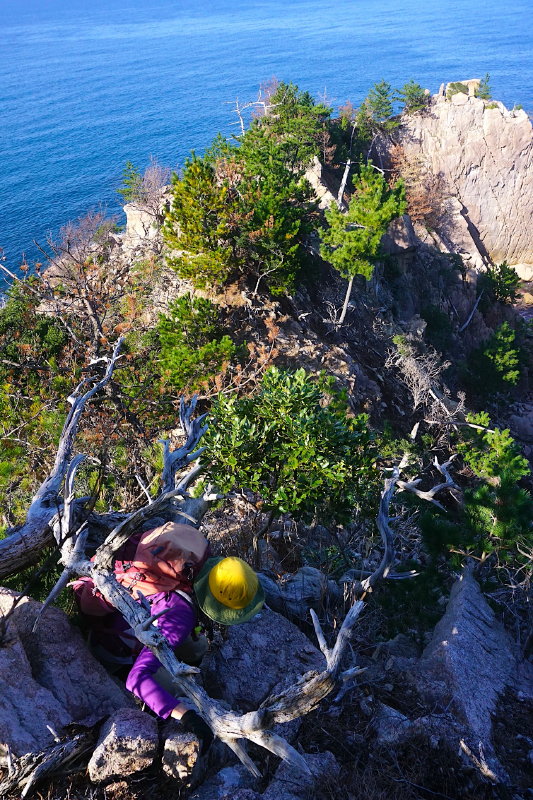標高180m小ピークから北西に曲がり下っていくと、煌めく青い空とさらに青い海、そして海に突き出した急峻な崖ときりりと尖った断崖絶壁が目に飛び込んだ。