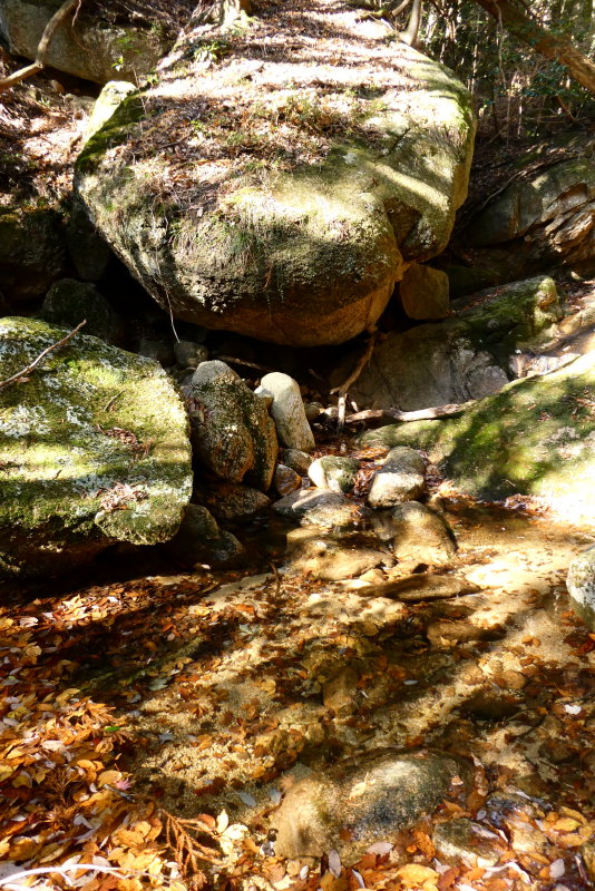 この場所は本当に良い所ですね!下り立ったところはちょうど法印のコバだった。渇水期の矢原川の細い流れに日が当たってきらめいている。