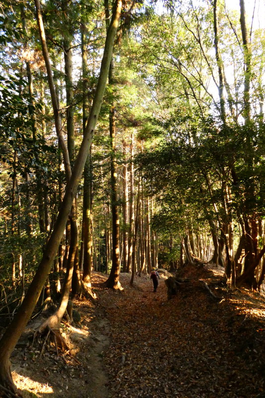 途中で分岐する道を左に取り、野登寺の入口から参道を下る。歩く人も少ないのか、落葉の下は石がゴロゴロして