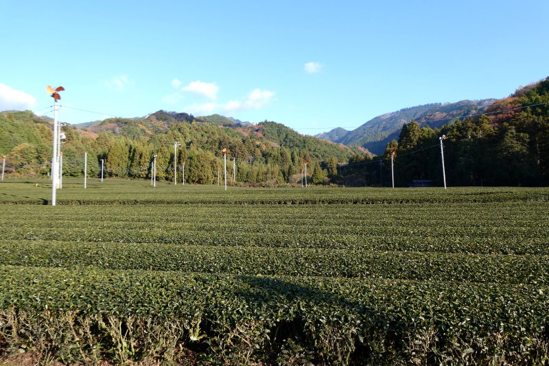 矢原川沿いに広がるのはお茶畑。そう、三重県は全国でも有数のお茶の産地なのですね。日本のお茶畑は、何で帯状にびっしりと植えられているのだろう、と思っていたのですが、ある時、お茶摘みの機械を見て納得しました。
