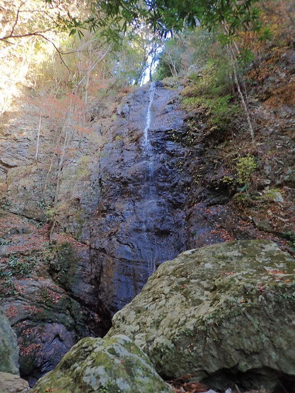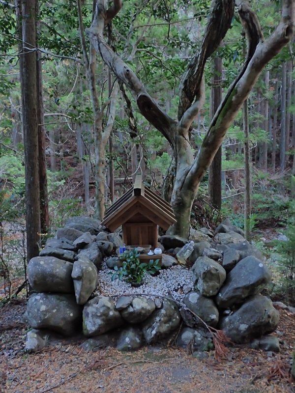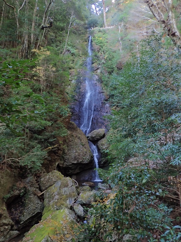 朝日に照らされた行者山を見ながら笠木川に沿って上り、もみじ館に駐車する。笠木渓谷の対岸には大きな嵓の間から笠木山が見え、鳥居をくぐり狭い谷筋に入ると笠木不動滝雄滝(40m)が緑の岩壁を一筋に切り裂いていた。滝肩の祠には享保7(1722)年4月と刻まれた武骨な不動明王像が祀られており、滝口には不動明王像の設置跡と思われる石積がある。雌滝に向かうと渓流沿いには三方を石積で守られた巨大な祠跡があり、ここで祈りの儀式をしていたのだろう。雌滝(30m)は水量が少なめで女性的な趣があると言われており、不動明王像は山崎三星が建立し文化3(1816)年に山崎守徳・覚丸が再建したもので洗練された小ぶりな石像だ。山崎氏は北畠氏の家臣として崎城を守っていた一族で、北畠氏滅亡後も地士として残り紀州藩から流域の管理を任されていた。山崎三星が不動明王像を建立した背景のひとつには幹線道笠木越の無事への願いがあっただろう。