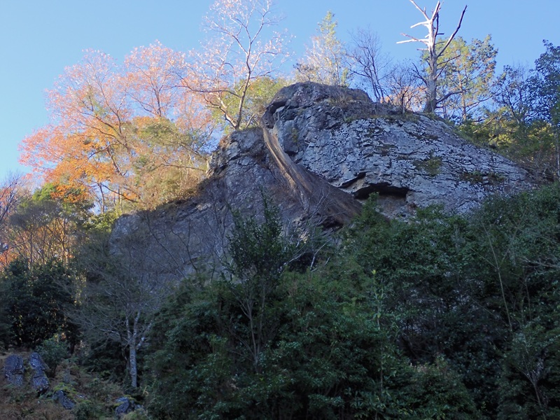 嵓に出会うと林道に出て、林道が笠木川を越えた所で中道登山道に入る。植林の尾根を進み嵓が目立ち始めると明るい常緑樹の道になっていく。二つの大きな嵓は左から巻くように道はつけられ、これがないと苦労する岩尾根だ。嵓の上からは柏崎の町並みとひと山越えた熊野灘が光り輝いている。笠木山(726m)から笠木高(678m)への稜線も嵓のある明るい岩尾根で、いくつも出てくる嵓は右から巻く道がつけられている。植林の道を覚悟していただけに、アトラクション満載の自然林の道は、昔の景色を思い出させてくれる。薗が眼下に見えると笠木高で、東尾根の600m付近の広くなった所にある笠木峠に向かう。