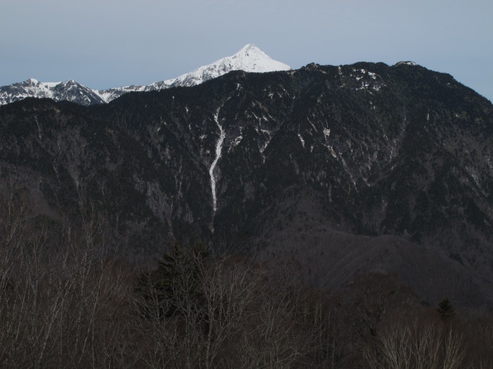 杉林の急登を抜けると落葉した木々の向こうに焼岳から白谷山への稜線が見渡せる。