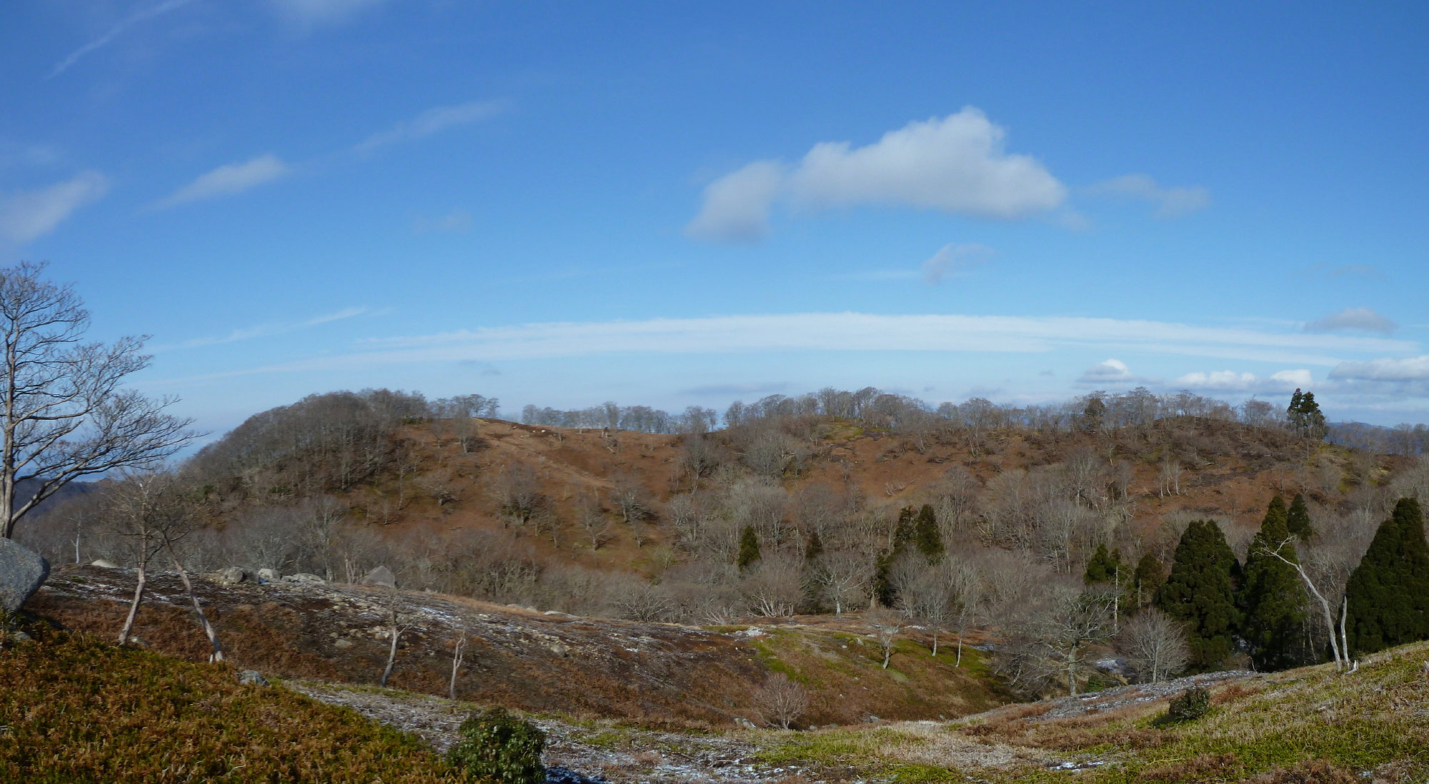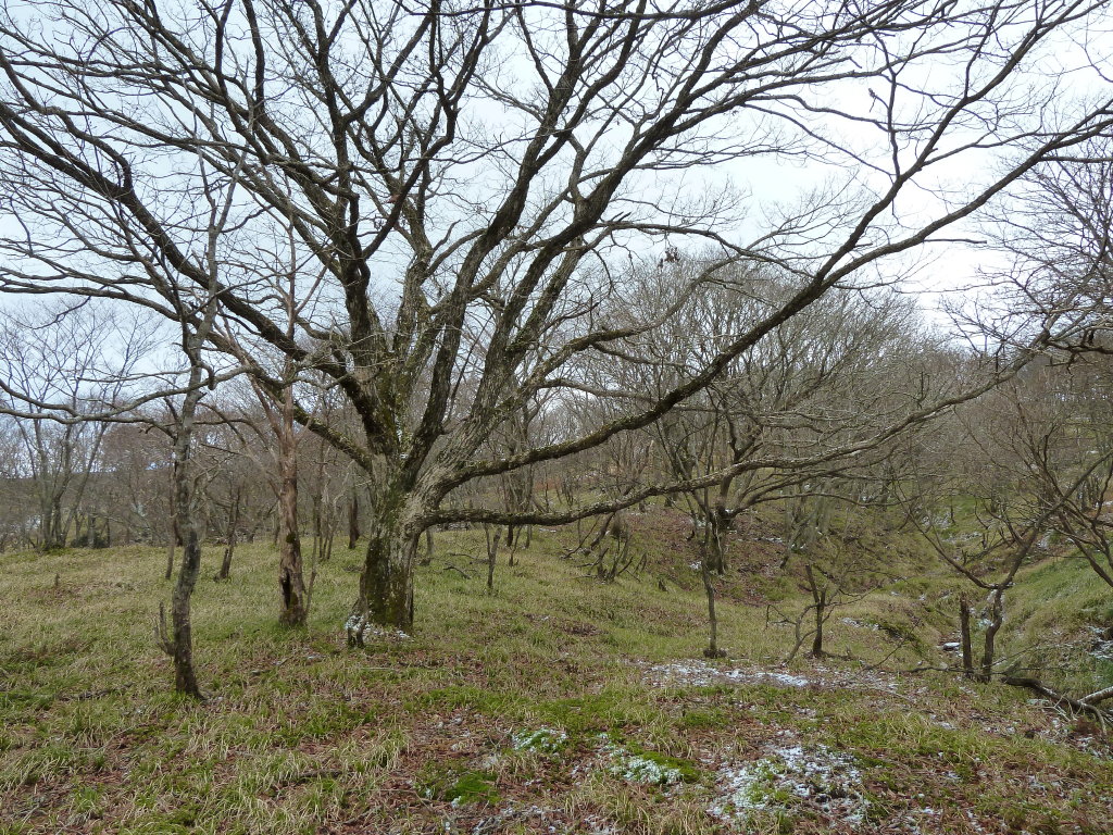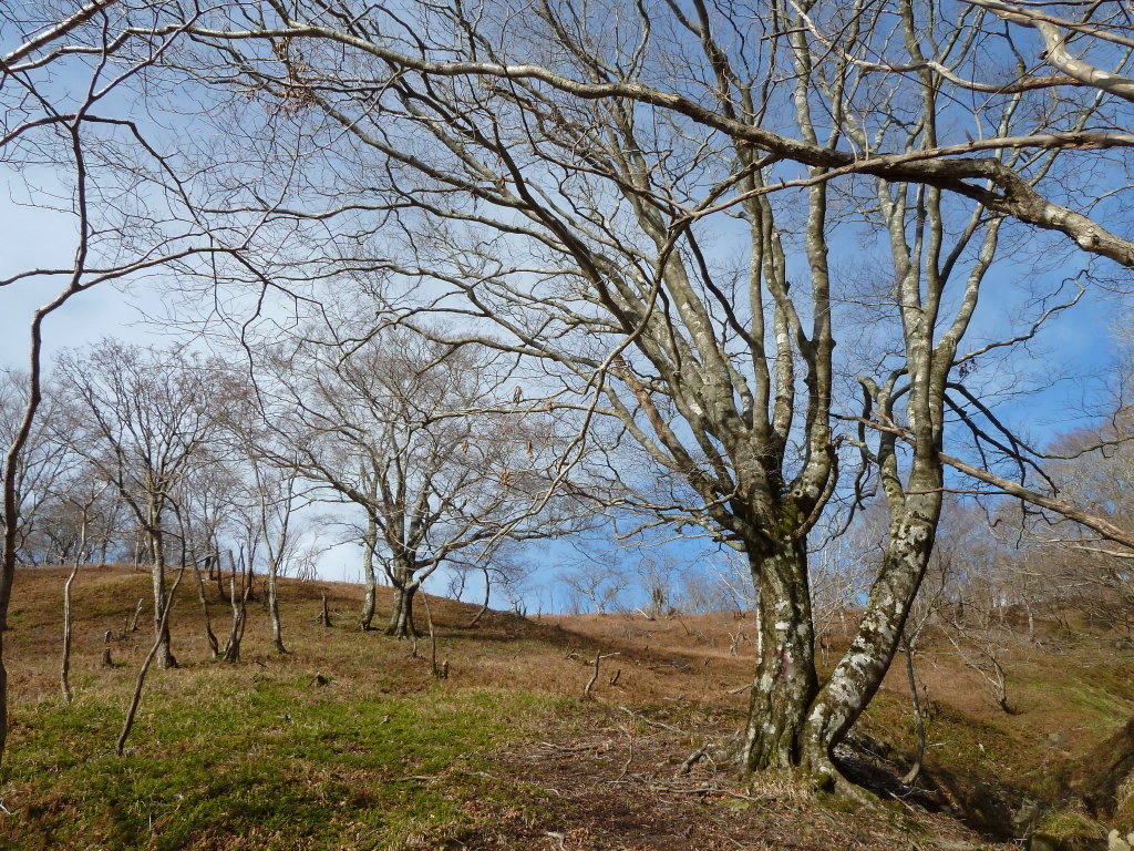 源頭は枝分かれした水流の間に疎林の台地が広がり、下部よりも伸びやかな場所だった。源流を横切って尾根に乗る。ここはイクチョの展望台。言わば熊ノ戸中央高原といった風情である。熊ノ戸サラウンド劇場と言ってもいいだろう。