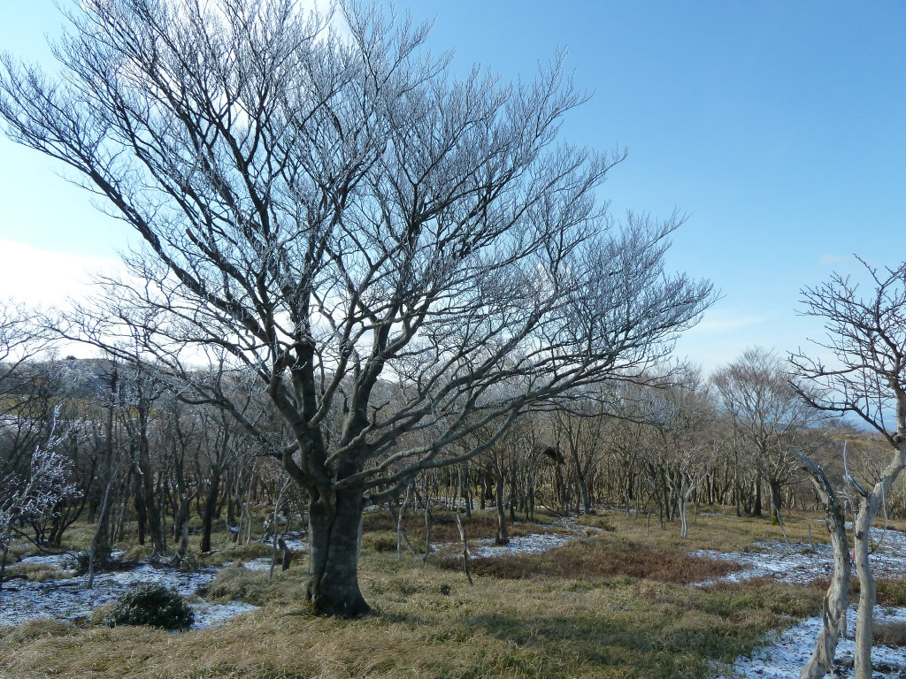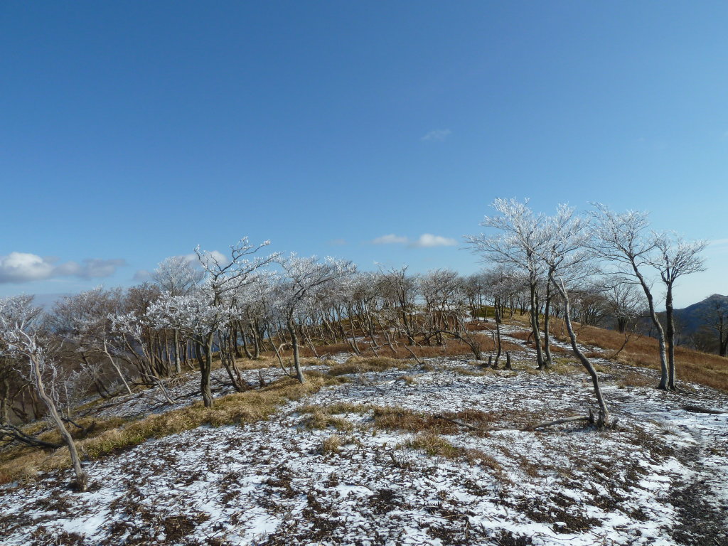を見て気が変わった。霧氷だ。こちら側も銚子方面も霧氷のカケラすら見当たらないのに、イブネだけは白い森になってい