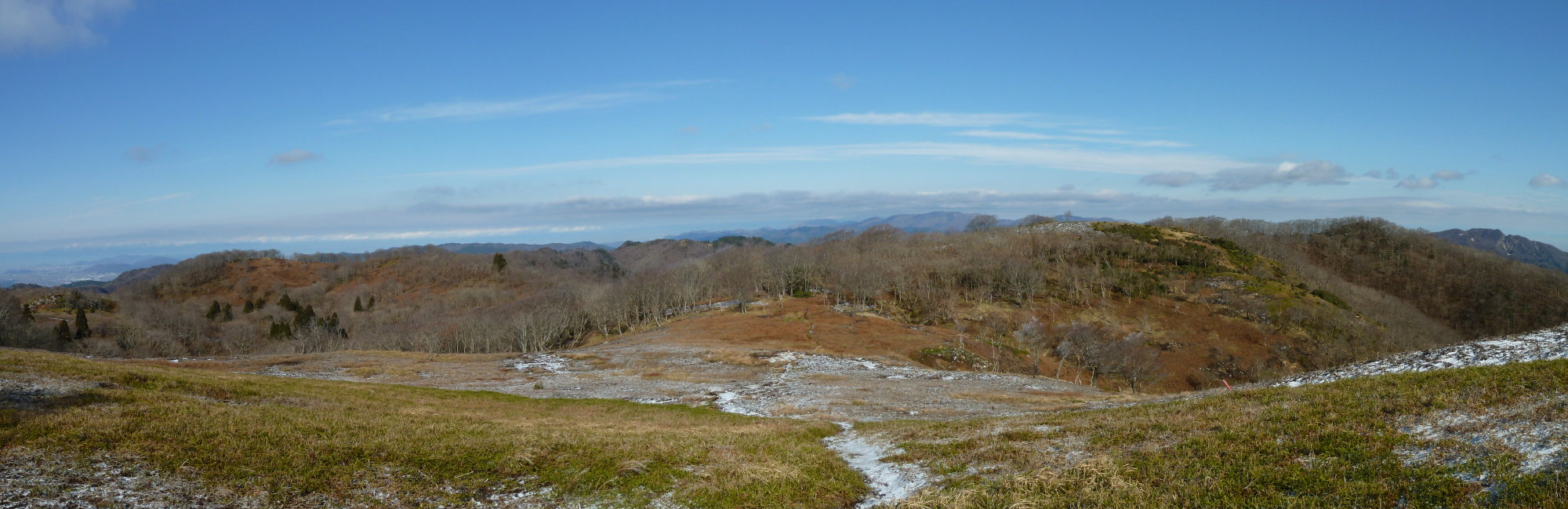 と伏木谷源頭の崩壊地が丸裸。峠の周囲も大きな広場のようになっていた。遠くに浮かぶ山塊は御岳や中央アルプス