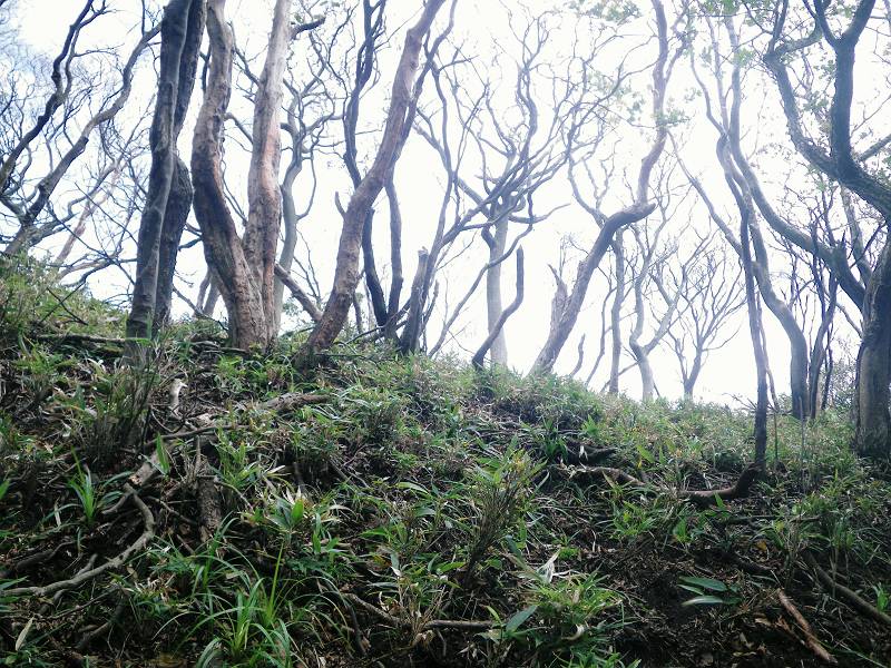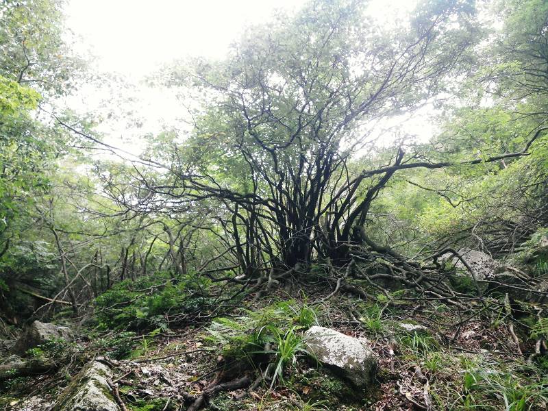 正面にザレ地形を見て、左の小さなルンゼに突っ込んだ。水路跡を詰める。鈴鹿らしい源流の雰囲気に破顔。小笹と灌木に包まれて高みを目指す。
