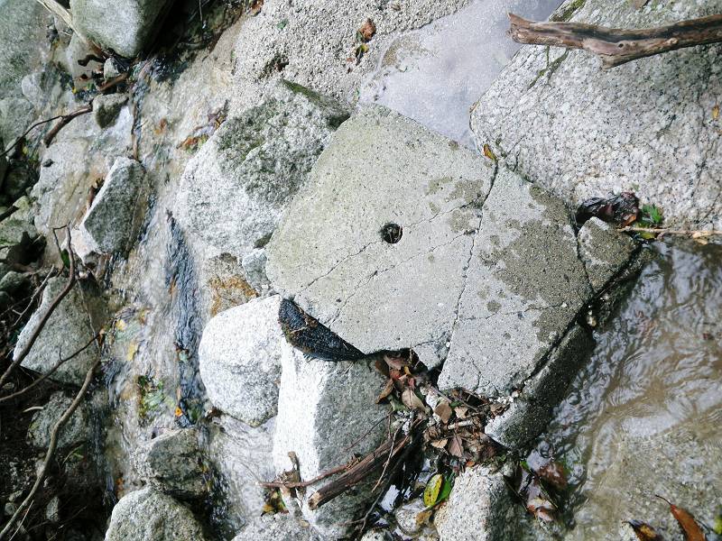 小滝を連ねるようになる。左岸に台地が広がる。こんなところで幕営してみたいものだ。炭窯跡が現れた。水路のフタなどと言う、意外な砂防人工物が落ちていたりもする。一体、あんたは、どこから流れてきたんだい?