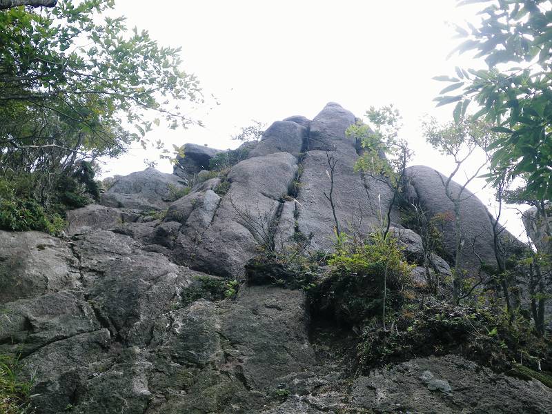 山では天上人でも、ひとたび家に帰れば天井人。天井裏部屋に押し込められて小さくなってますわ。^^;いきなり岩の基部の展望地に飛び出した。重ね岩の裏手の岩塊群だ。指のような巨岩が天を指している。見下ろすと電波塔跡がさら地になっている。伊勢平野と伊勢湾も遙か眼下だ。