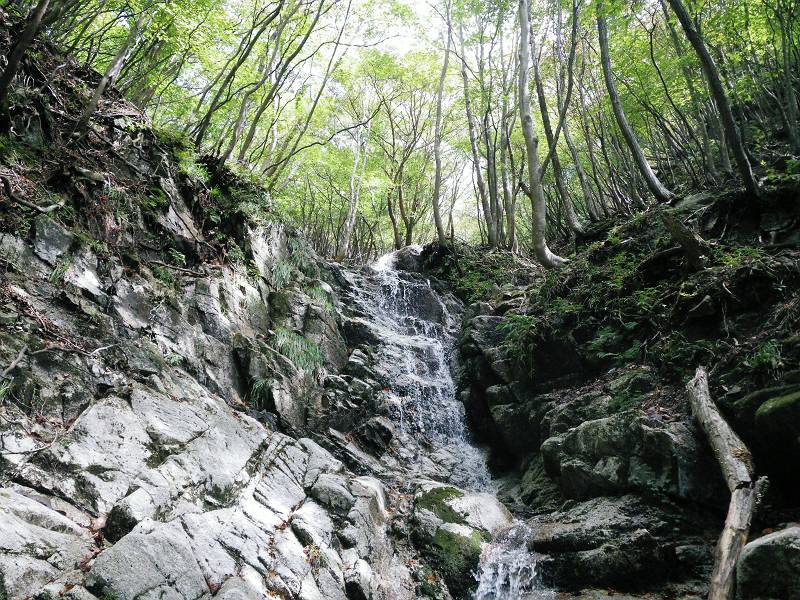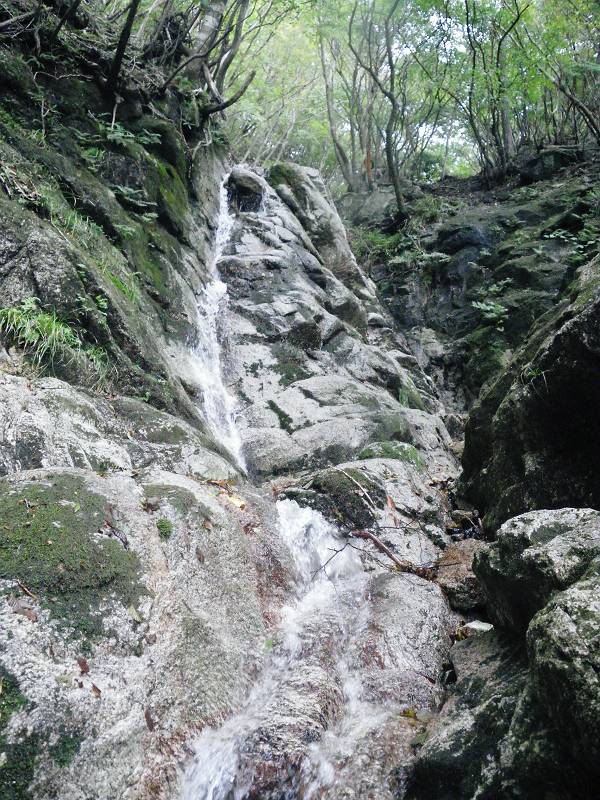 気を取り直して左岸の巻きで上がると二俣となった。渓相的には左俣の方が登高意欲が増すが、水なしじゃどうしようもない。右俣に水流を追う。小滝を連ねて標高を上げる。トユ状の連瀑帯をガシガシ登っていく。