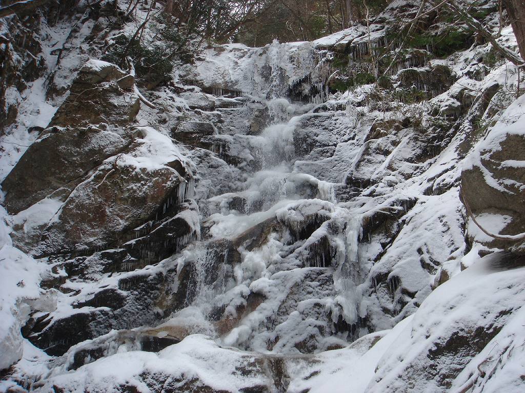 >それでも三つ口大滝が見たくなったので分岐にザックをデポして滝見物。岩の間の雪に足>をとられないように、まあいいかっで流れの中を行く。氷の厚さはさほどではないけど今>年も来たよのご挨拶。ぼ~っと見ていると心が落ち着くね。やっぱパソコンばかりやって>ちゃダメだね。