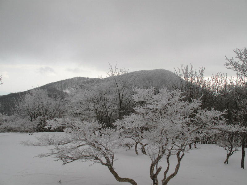 頭陀ヶ平では樹氷が見られた。御池岳が正面に見えるもののテーブルランドはガスで見えない。樹氷のついた藤原岳天狗岩方面がよく見える。あの日は日本海方面から沢山雲が流れてましたし、すっきり晴れてはくれませんでしたね。