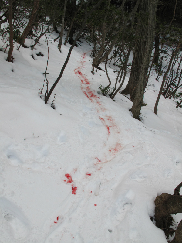 >尾根に乗る少し下に赤い道が見える。近づくと獣の血だ。人間と犬の足跡もあるので、猟師にウサギが打たれたようだ。