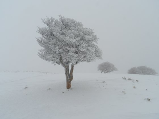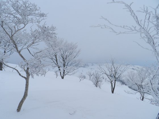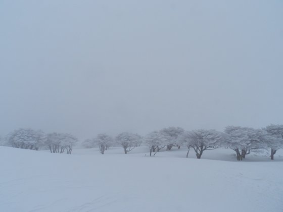 この日は藤原岳にいましたが、ガスって何も見えないのは変わりませんが、風は穏やかでした。笹山の竜ヶ岳は強風が吹きぬけて辛いですね。竜ヶ岳を目指す時はいつも天気図と睨めっこです。懲りずに天気のいい日にまた出かけてください。真っ白な竜ヶ岳が青空に映えて綺麗ですよ。