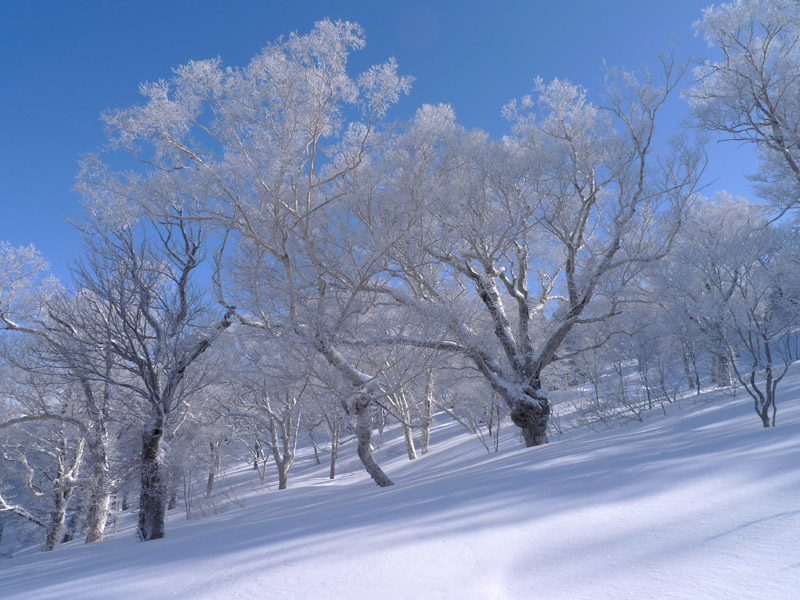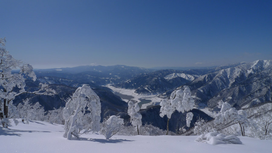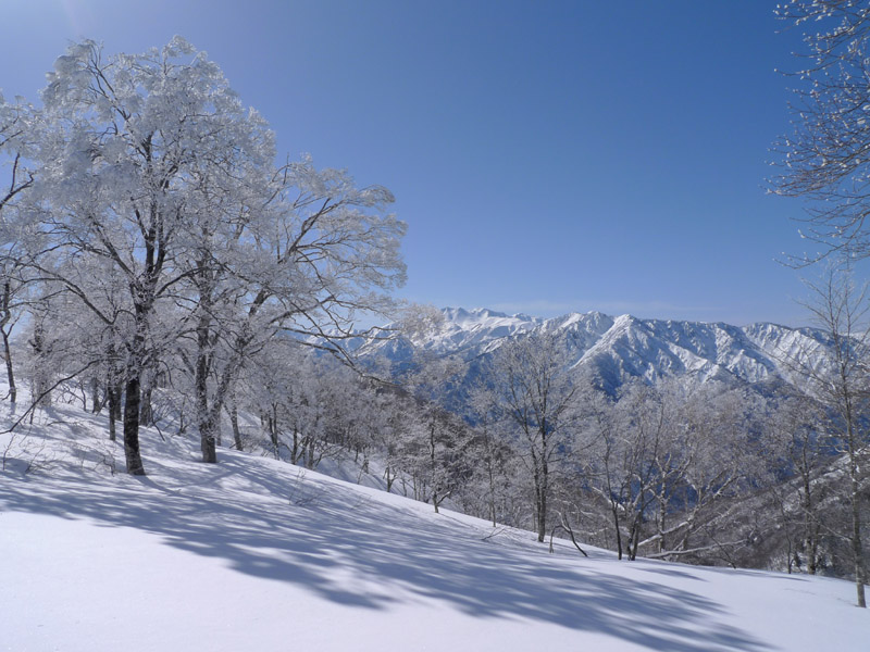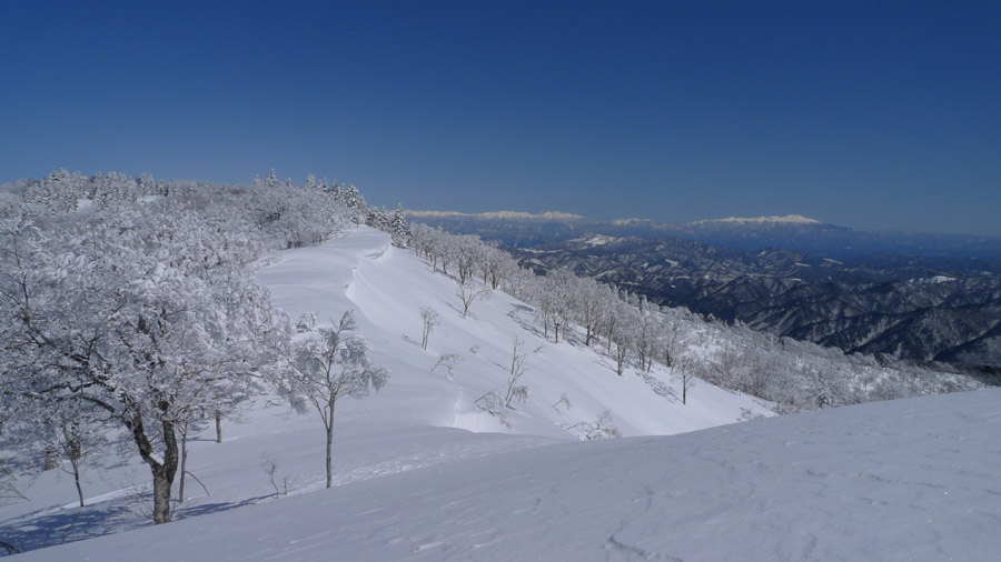 1400mあたりの広い窪地あたりから今回のルートの見せ場が始まった。ブナやミズナラが入り混じった明るい雪原が広がっている。斜面のとおり少し南に進む。南西に延びる尾根に乗ると南側が開けている。尾根には樹氷の森が続いている。そして北を望めば白く樹氷に覆われた広いピークが紺碧の空の下にどっしりと座っている。今日、この場所にいられたことをとても嬉しく思う。