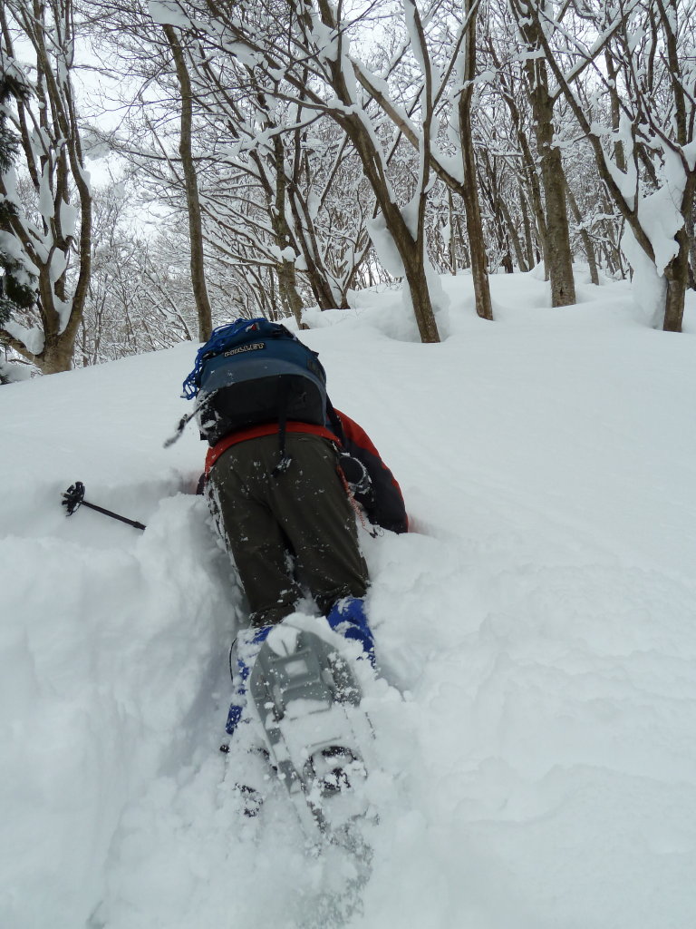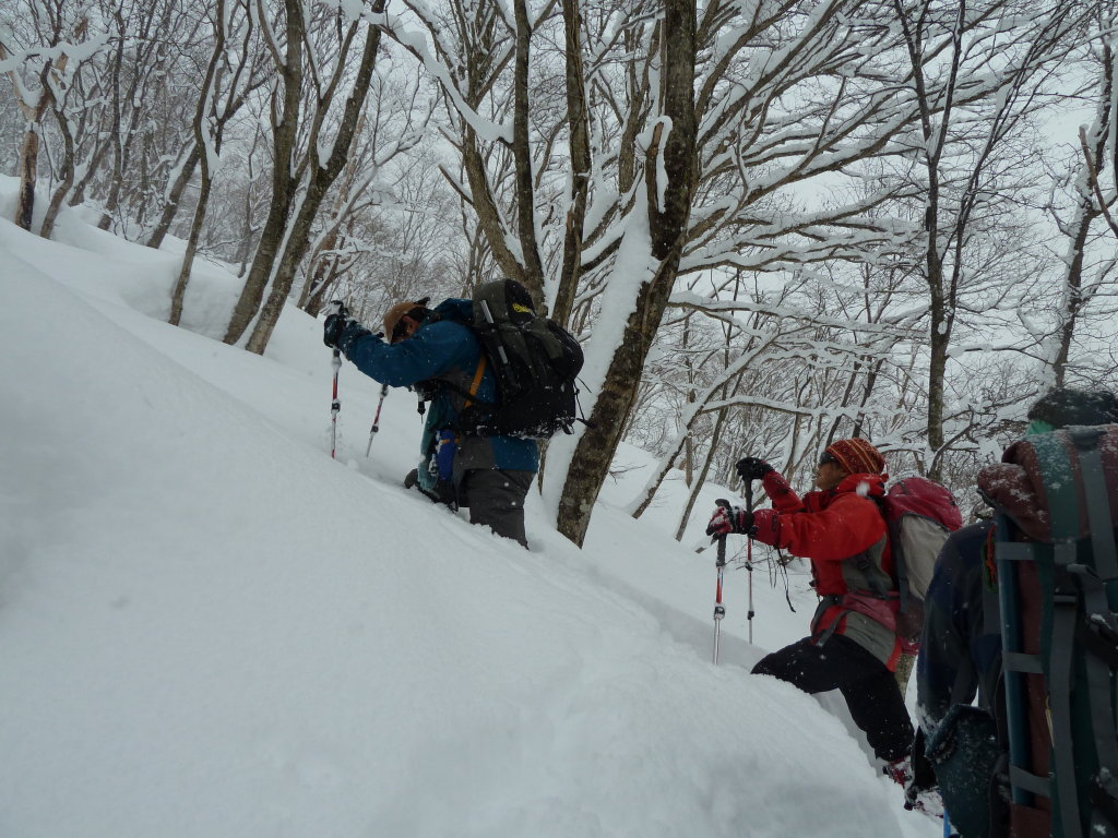 急傾斜のところでは雪も壁となって、普通のラッセルでは通用しない。頭の高さ以上の雪を崩して足場を作り、確実に体重を