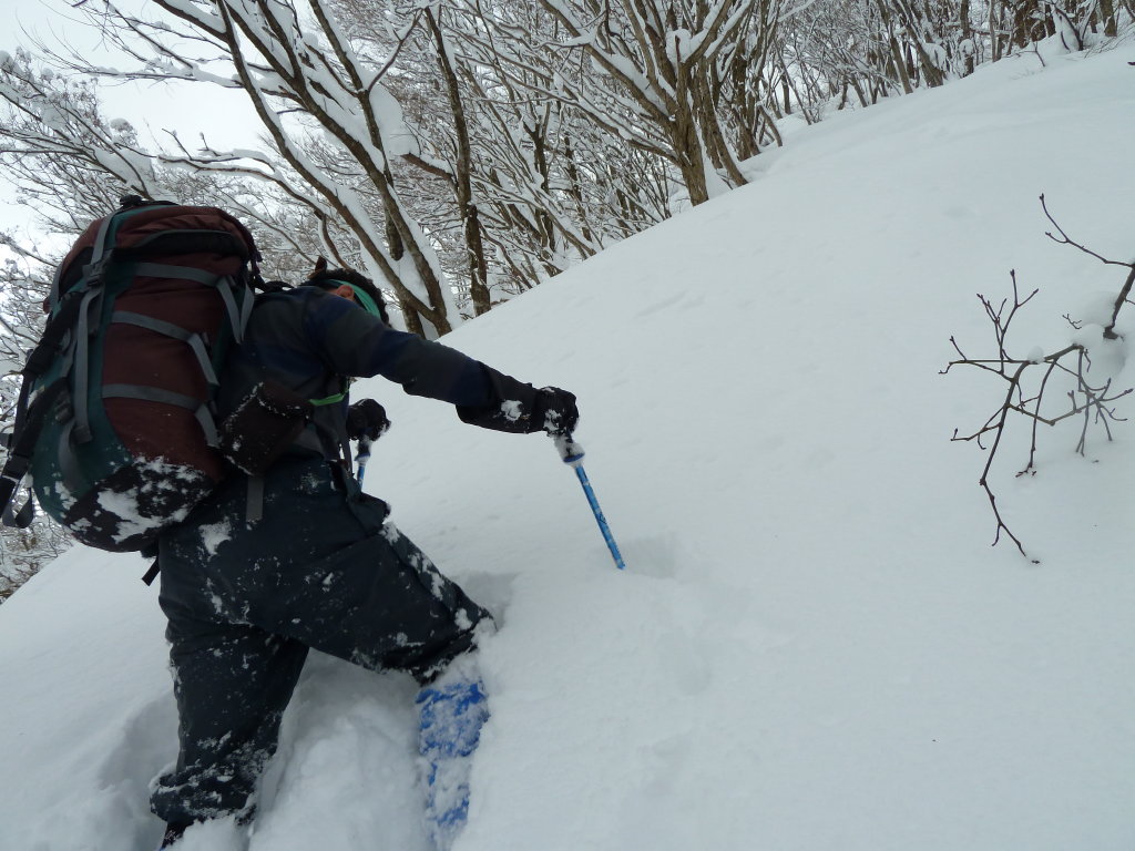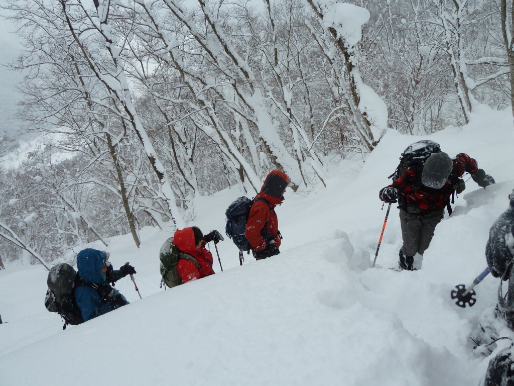 >急傾斜のところでは雪も壁となって、普通のラッセルでは通用しない。頭の高さ以上の雪を崩して足場を作り、確実に体重を