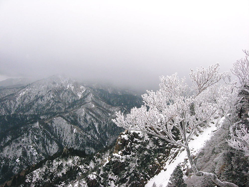 東峰へ戻るとガスの晴れる気配があったので少し待つ。すると一瞬陽が差した。体中に温もりが漲る。太陽の力は偉大だ。それも20秒位だったか、後にも先にもそれきりだった。しかし山々の展望が現れ、やっとカメラの出番だ。高い山の山頂までは見えないが、いっきに高度感が増す。弟子は喜んで、山を背景にザックを担いだ写真を撮ってくれという。年賀状に使うとはしゃいでいる。 帰路は同じルートを辿るが、あれほど荒らした足跡がきれいさっぱり無くなっていた。雪が流れる日はよくあることだ。当たり前だが、下山は苦労した場所も嘘のように楽だ。往路で谷へ下りた個所も検証する。やはりあのままトラバするのがルートであり、雪の下にはちゃんと道があるのだろう。帰路抜きつ抜かれつの二人組と話す。彼らは往路トラバが怖かったので「危険・通行禁止」表示の尾根を登ってモノレール駅に出たそうだ。別に危険な個所はなかったそうな。あほらし。
