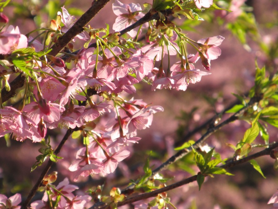 R260を走って行く、東宮集落を過ぎ山道を登り始めた所にはきれいな桜が満開で車を道端に寄せた。朝日に照らされた桜は色濃くかがやく。早咲きの川津桜なのであろうカメラを向けた。